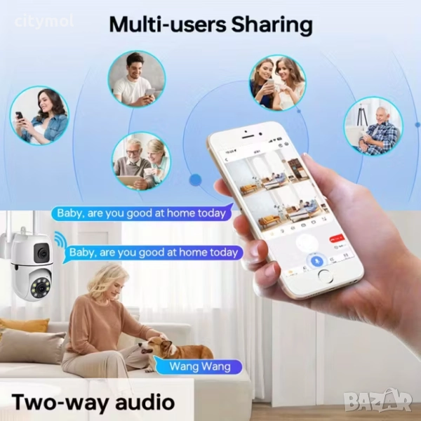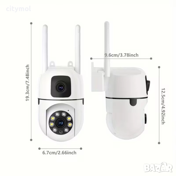 Наблюдение и управление на камерата през интеренет където и да се намирате по света с приложението за смартфон или компютър през браузера. Едната камера се позиционира и наблюдава точно определена област. А втората камера е управляема и можете да я позиционирате във всяка посока!