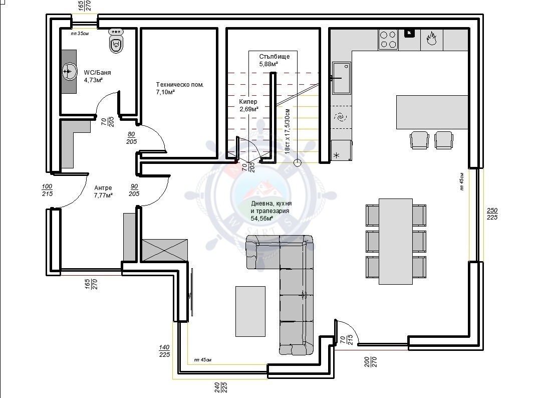 На партерно ниво със ЗП 102 кв.м са разположени: просторна дневна с кухня и трапезария, килер, баня с тоалетна, техническо помещение и входно антре. Възможност за четвърта спалня.