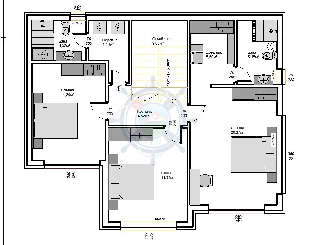 Вторият етаж се състои от: три спални, перално помещение и баня с тоалетна. Към родителската спалня има панорамна тераса, дрешник и баня с тоалетна.