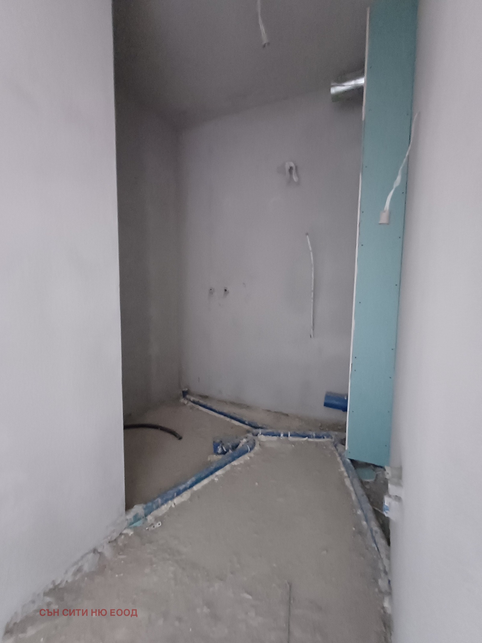 Разпределение: просторна дневна с кухня и трапезария/30кв.м./, две непреходни спални/ всяка по 16кв.м./, баня с тоалетна, втора тоалетна,дрешник, антре и