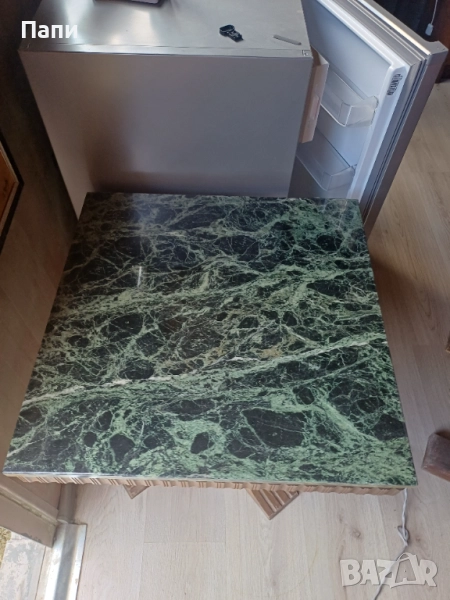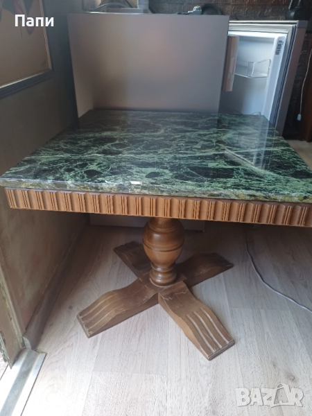 Масата е с дървена основа и мраморен плот 53в плот60-60см.