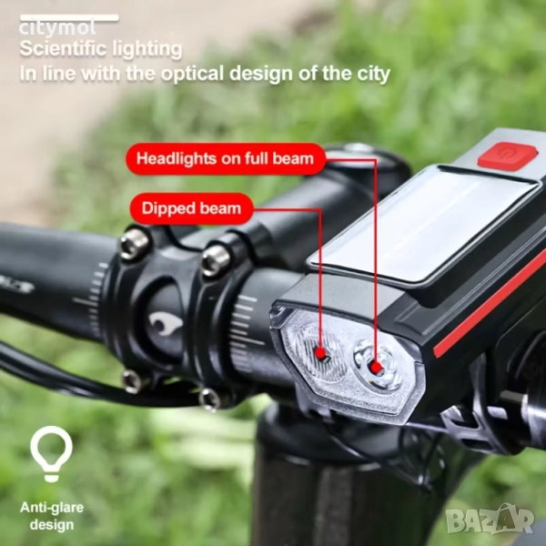 Соларен фар и клаксон за велосипед/скутер, зареждане от слънчева енергия и чрез USB кабел, единични къси светлини, двойни дълги светлини и мигащ режим, водоустойчив, фотоволтаичен панел, интегриран във фара.