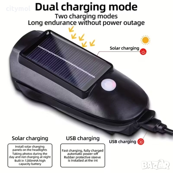 Открийте ефективността, гъвкавостта и мултифункционалността на този LED фар със соларно зареждане , USB захранване и клаксон , идеален за вашия велосипед или скутер.