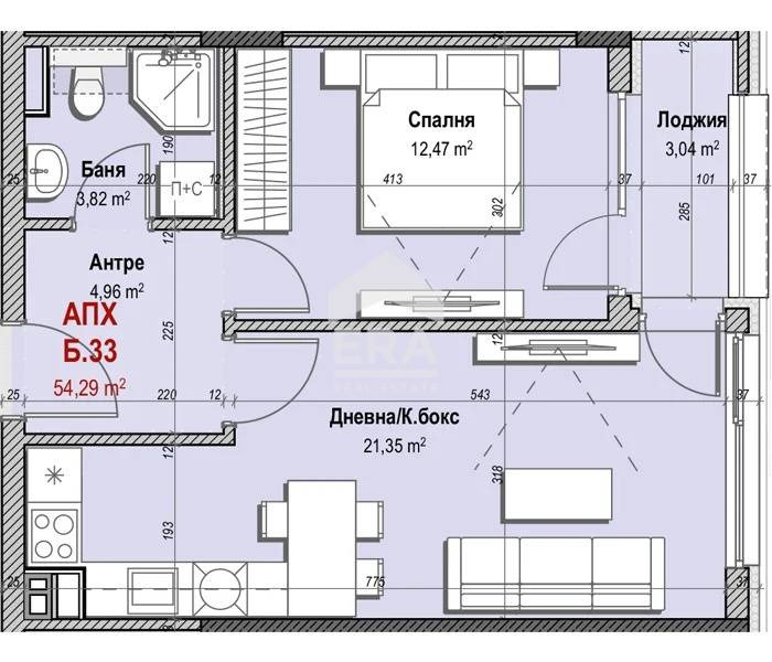 Представяме на вашето внимание двустаен апартамент 33 в сграда Б, включващ светла дневна с кухненски бокс, спалня, баня с тоалетна, антре, лоджия и склад.