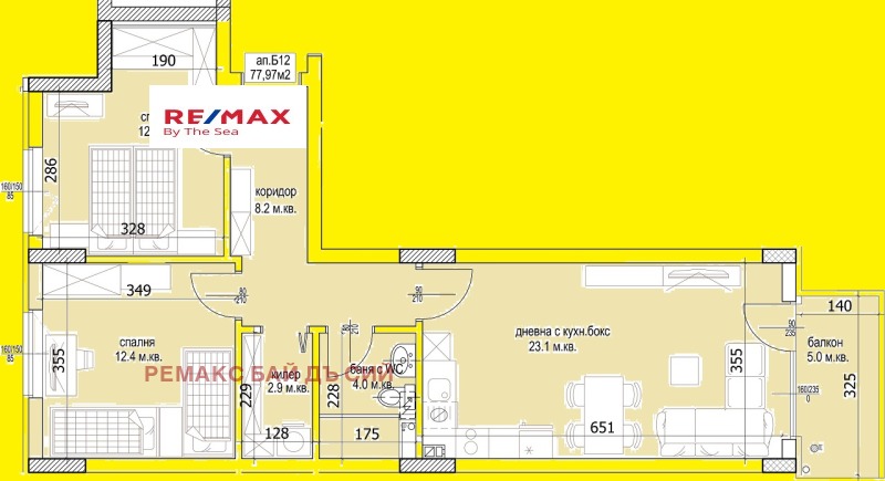 Апартаментът е със площ от 90.77 кв.м. и се състои от голяма дневна, родителска спалня, детска стая, балкон, баня/тоалетна, килер и коридор.