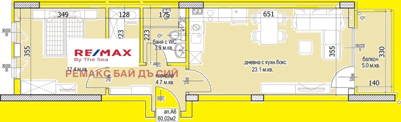 Апартаментът е със площ от 60.02 кв.м и се състои от голяма дневна, спалня, балкон, баня/тоалетна, килер и входно антре.