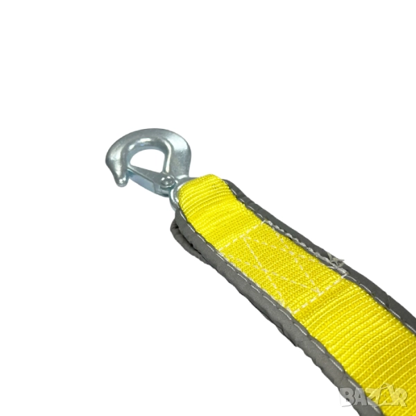 Висококачествен колан за теглене, изработен от усилен полиестер с изключителна здравина и издръжливост. Предназначен за безопасно теглене на автомобили и лекотоварни превозни средства с максимално тегло до 6 тона. Дължината от 4 метра осигурява оптимално разстояние между автомобилите, а светлоотразителните елементи гарантират отлична видимост дори при намалена осветеност или нощно време, което повишава безопасността при работа на пътя.