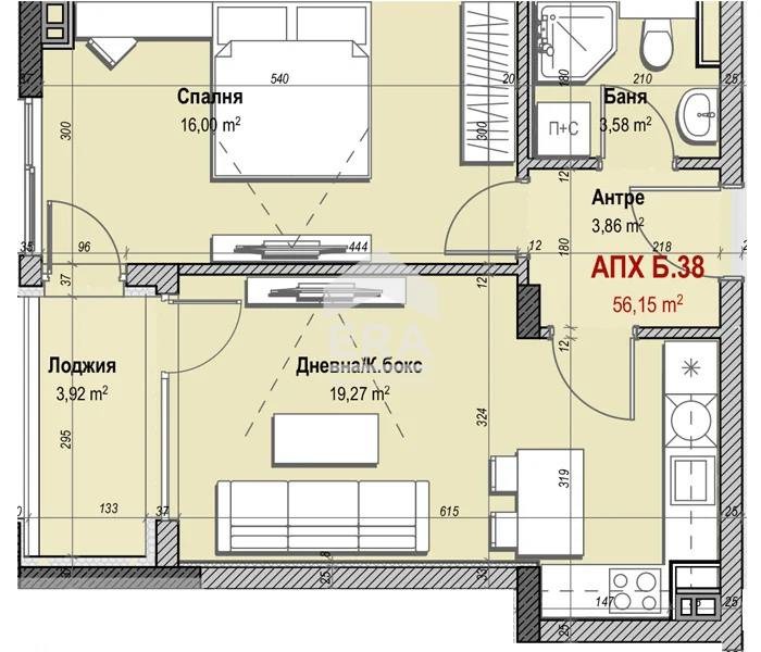 Представяме на вашето внимание двустаен апартамент 38 в сграда Б, включващ светла дневна с кухненски бокс, спалня, баня с тоалетна, антре, лоджия и склад.