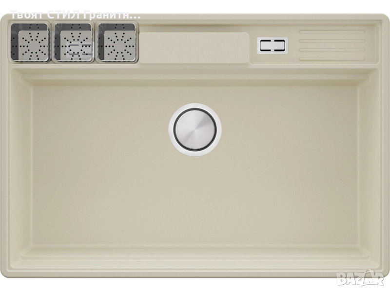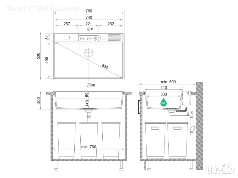 Продуктовите снимки показват предложената инсталация със сифони Твоят Стил. Преливникът и цедката, които се виждат на графиката, не са елементи от мивката и се продават отделно. За правилното монтиране на мивката е необходим персонализиран сифон с вертикален преливник.