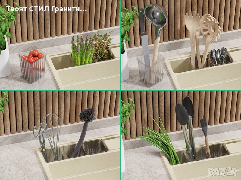 - Органайзери отляво за прибори за хранене, кухненски принадлежности или билки