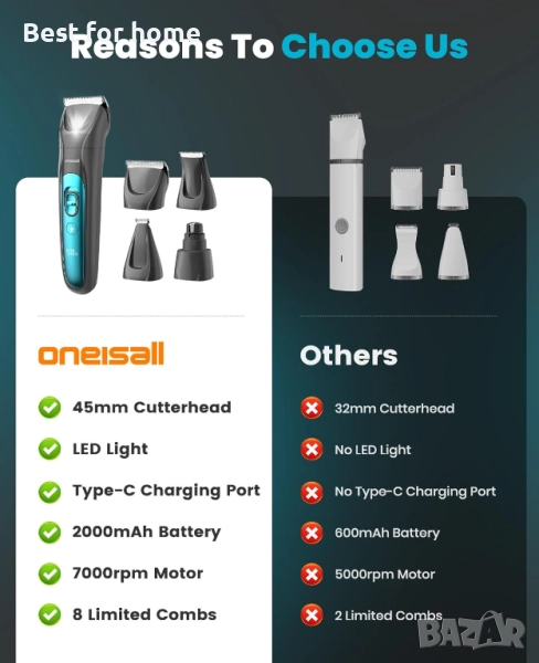 Революционен комплект за подстригване на цялото тяло на домашни любимци: Харесва ми, че машинката за подстригване на кучета oneisall FC10 има 4 сменяеми глави. Голямата глава реже гъстите ми къдрици като масло; извитата глава подстригва лицето и ханша ми под по-безопасен ъгъл от ножицата, от която се страхувах преди; главата за подстригване на лапи отрязва космите от лапите ми толкова добре, че вече не се подхлъзвам и не се чувствам чувствена; а ножорезачката заоблява ноктите ми, така че мога да прегръщам мама, без да се притеснявам, че ще я нараня! Това промени начина, по който мама ме подстригва. Сега не е нужно да купува различни инструменти за подстригване на различни части от тялото ми, така че не е нужно да харчи повече пари за това.