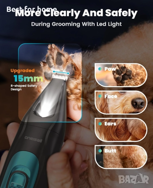 По-ясна видимост, безопасност дори в най-малките зони: Този тример за кучета е оборудван с LED светлини, така че когато мама подстригва процепите на лапите и ушите ми, тя може ясно да вижда всеки детайл, без да се притеснява, че ще ме пореже.
