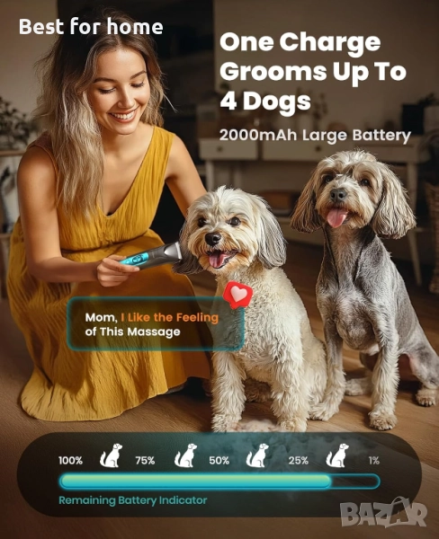 Подстригване на 2-4 домашни любимци с едно зареждане: Машинката за подстригване на домашни любимци е оборудвана с батерия от 2000 mAh, така че мама може да подстриже цялото ми тяло 4 пъти с едно зареждане. А самобръсначката за кучета има индикатор за оставаща мощност, така че мама не е нужно да се тревожи, че ще ѝ свърши батерията по средата на подстригването.