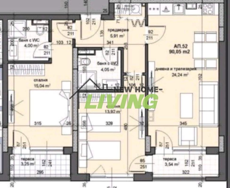 Имотът е с обща площ от 104,90 кв.м. и чиста жилищна площ 90,05 кв.м.