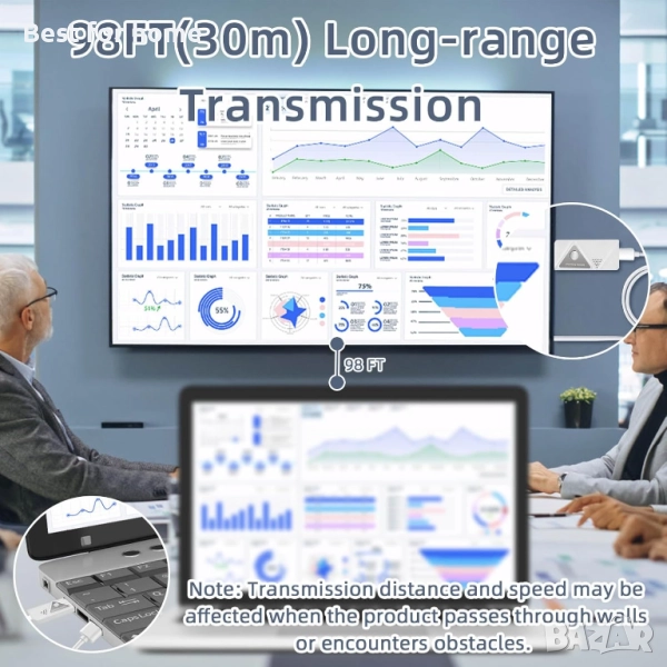 Безжично предаване на 98 фута/30 метра: Разстоянието за безжично HDMI предаване достига до 98 фута/30 метра, използвайки 2.4G/5G протокол за предаване за силен сигнал против смущения и висока стабилност (Забележка: Разстоянието и скоростта на предаване могат да бъдат засегнати, когато продуктът преминава през стени или срещне препятствия.)