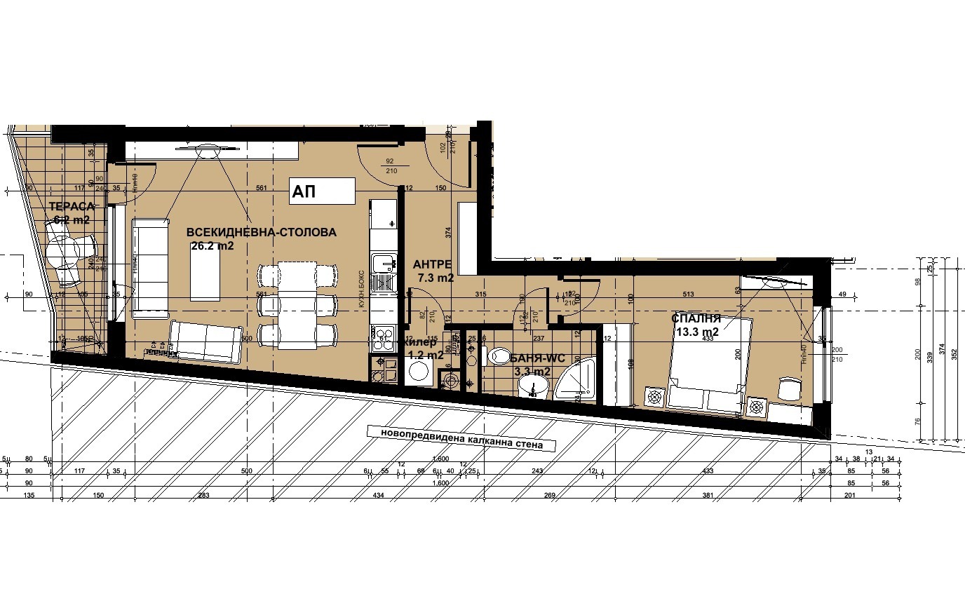 Двустаен апартамент в кв.Кръстова Вада на комуникативно място на 7-8 минути от МОЛ Парадайс и метростанция Витоша (около 600 метра).Етаж 3 с Цена 216500Евро. Срок за Акт 16- Декември 2026г. Двустаен апартамент в новострояща се жилищна сграда, състоящ се от: входно антре(7,3кв.м), кухненски бокс с трапезария и дневна(26,2кв.м), непреходна спалня(13,3кв.м), баня с тоалетна, килер - мокро и тераса пред дневната. Прилежащо Мазе - 3кв.м. ИЗЛОЖЕНИЕ Изток/Запад. Застроена площ 68кв.м.Продава се на шпакловка и замазка, монтирани външна блиндирана и вътрешни врати, Дограма с двустранно отваряне - Reynaers.Индивидуално газово котле, алуминиеви радиатори с винтили. Възможност за закупуване на паркомясто или гараж.Сградата ще бъде изпълнена с висококачествени материали, вентилируема окачена фасада - Laminam, шумо и топло изолация между апартаментите, луксозни общи части. Инвеститорът е с множество завършени сгради и комплекси. Гъвкава схема на плащане според, която се определя цената. Обявената цена е крайна с включено ДДС. За Сградата: разположена е в най-модерната и предпочитана част на район Лозенец. Той съчетава изключителна визия, сигурност, умни технологии, функционалност на разпределенията и не на последно място отлична локация и комуникации. Намира се на бул. Черни връх , на пешеходно разстояние са метростанция, спирки на градския транспорт, Мол Парадайз, ресторанти, магазини, детска градина, болница, църква, Южен парк и др. Оставете колата си в подземния паркинг и се разходете до Мол-а или парка! Оставете спокойно вашите деца-тийнейджъри да отидат до Мол-а на среща, придвижвайки се по тротоар, без да се налага пресичане на булевард. Жилищна сграда от градски тип. В нея има 107 жилища, различни по вид и разпределение, 5 магазина и кафе-сладкарница. Има подземен паркинг, в който има обособени паркоместа и гаражи. За да стимулираме екологичното поведение на собствениците и опазване на околната среда, в подземния паркинг има зарядни станции за електромобили и места за велосипеди. За да се чувствате сигурни във Вашия Дом, на входа на сградата ще Ви посреща портиер, а електрическият асансьор ще Ви заведе до Вашия Дом или до подземния паркинг. Всичко това ще се случи при режим на контролиран достъп и видеонаблюдение!
