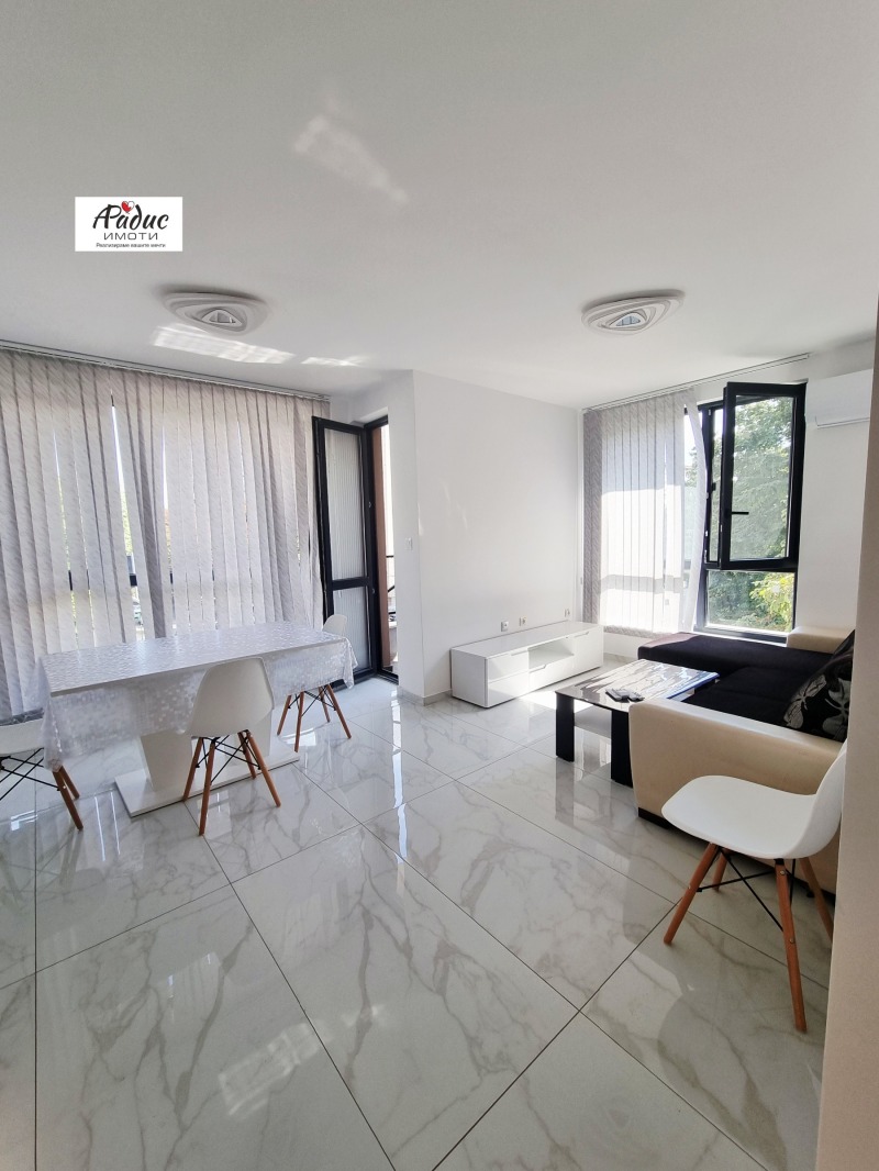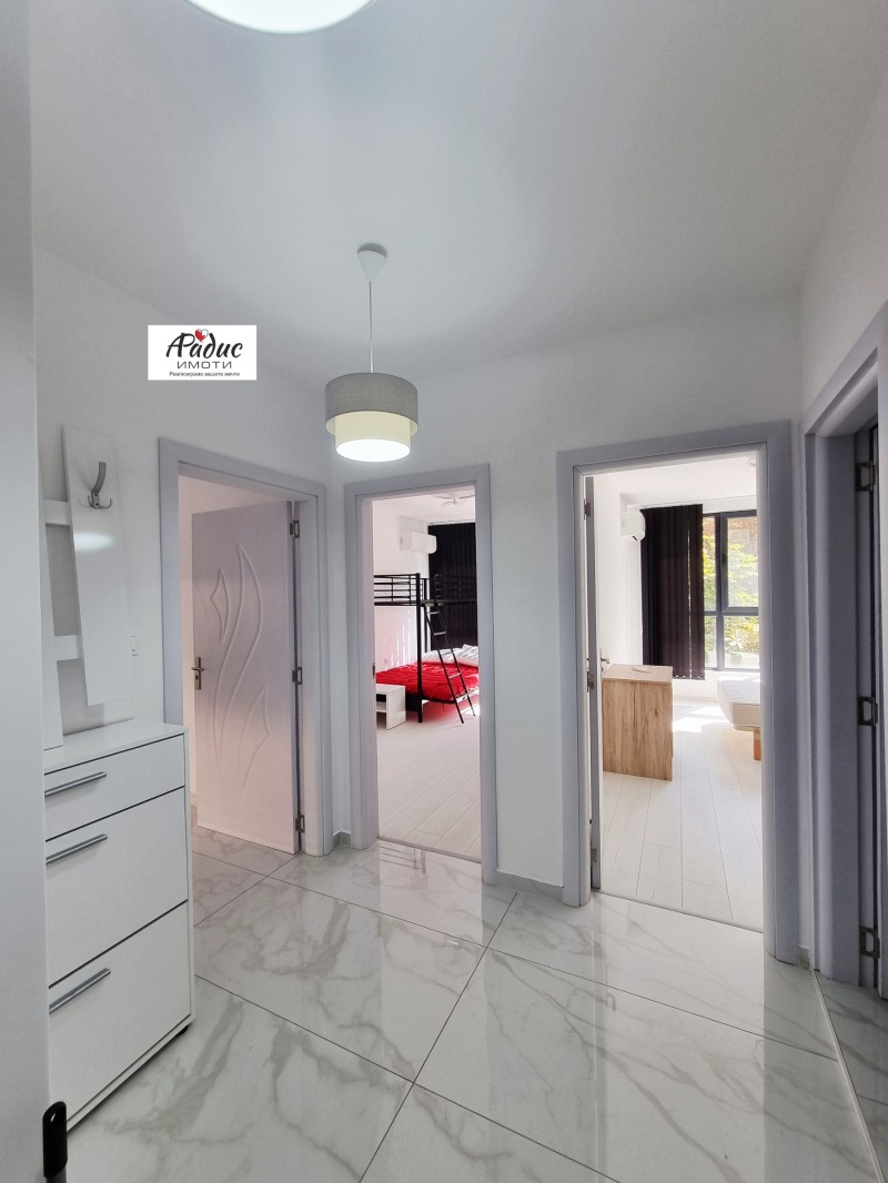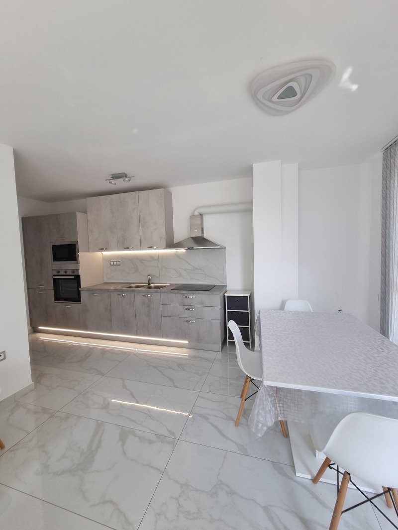 Апартамента се състои от всекидневна с кухненски бокс,антре, две бани, две спални и терасА. Жилището е ново строителство от 2025година и се предлага обзаведено с нова кухня с включени пералня, вградена фурна и котлони. Стаите са с климатици. Готови бани. Изложение: юг и изток. Жилището е на трети етаж. Блока разполага с асансьор и с контрол на достъпа.