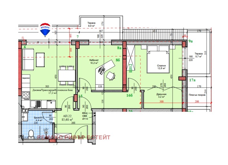 - всекидневна и кухня в отворено пространство с излаз на тераса