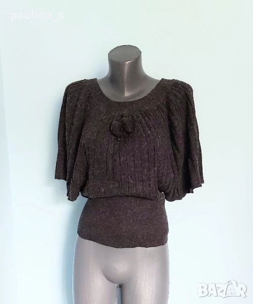 кашмир и вълна(вълна, кашмир и спандекс) и е доста еластично. Моделът е много шармантен, може да се носи и върху връхна дреха. Деколтето е декорирано с пампули, ръкавите са плисирана прилепи.