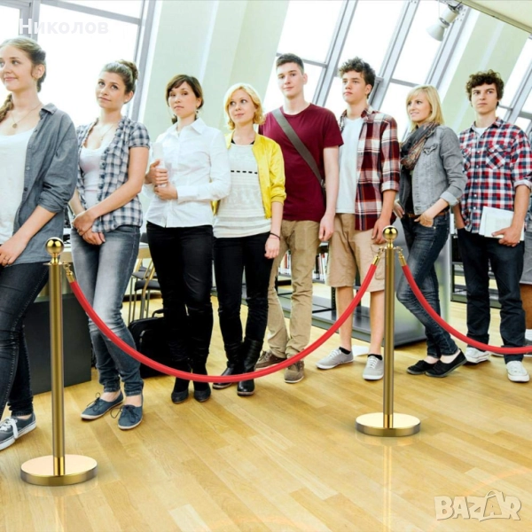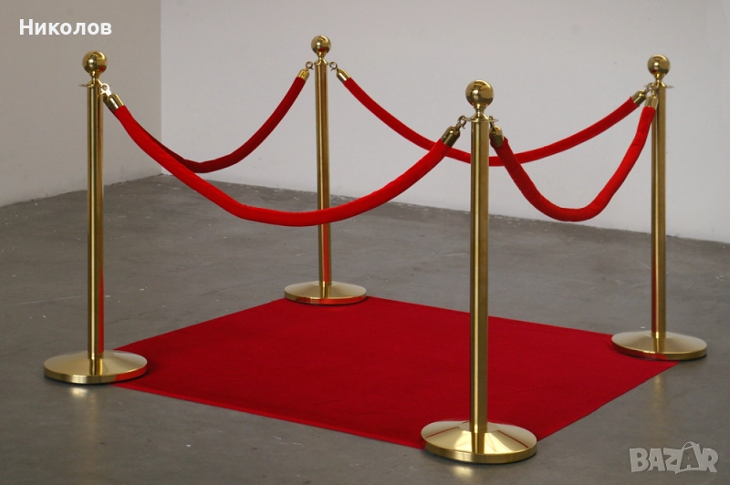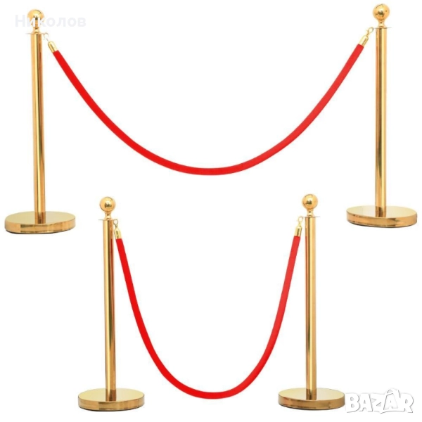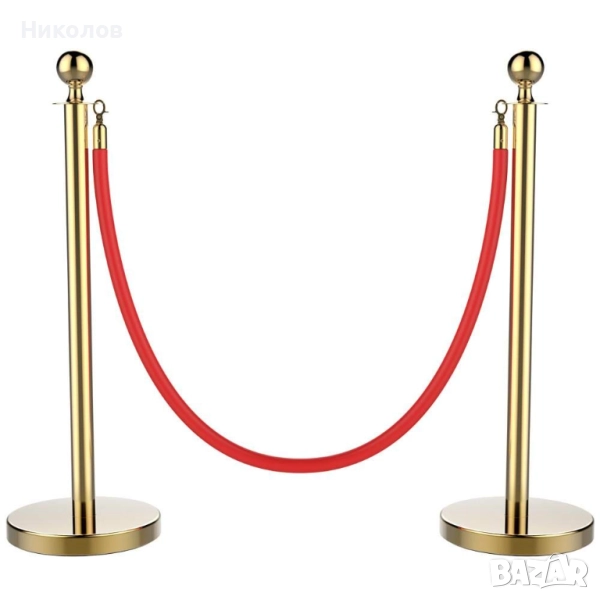 Комплект от две стабилни и елегантни златисти метални ограничителни пилона/колчета с едно червено въже. Въжето е велурено със златисти самозатварящи се куки за закачане. Стоперите могат да бъдат свързани в произволни форми. Произведени са от полирана стомана, издръжливи и лесни за почистване. С помощта на тези ограждения ще може да ограничите определена зона или да забраните достъп до нея, както и да използвате огражденията за указване на посоката в зали, ресторанти, банки, хотели, конференции и събития и други мероприятия. Дължината на въжето е 150см. Височината на колчето е 95 см. с диаметър на основата - 32 см., дъното е полимерно, не се пързаля дори и при мокър под. Тегло - 6.5 кг. Предназначени са предимно за вътрешна употреба.