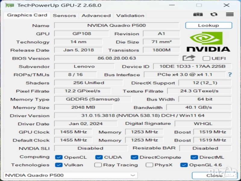 ВИДЕО КАРТА NVIDIA Quadro P500 2GB DDR5(професионална графика за CAD, 3D, дизайн, Adobe, SolidWorks и др.)