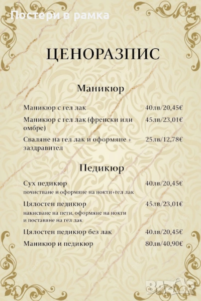 Ценоразпис за Салон за красота, снимка 1 - Фризьорски столове - 51839414 Ценоразпис за Салон за красота, снимка 2 - Фризьорски столове - 51839414 Ценоразпис за Салон за красота, снимка 3 - Фризьорски столове - 51839414 Ценоразпис за Салон за красота, снимка 4 - Фризьорски столове - 51839414 Ценоразпис за Салон за красота, снимка 5 - Фризьорски столове - 51839414 Ценоразпис за Салон за красота, снимка 6 - Фризьорски столове - 51839414 1/6