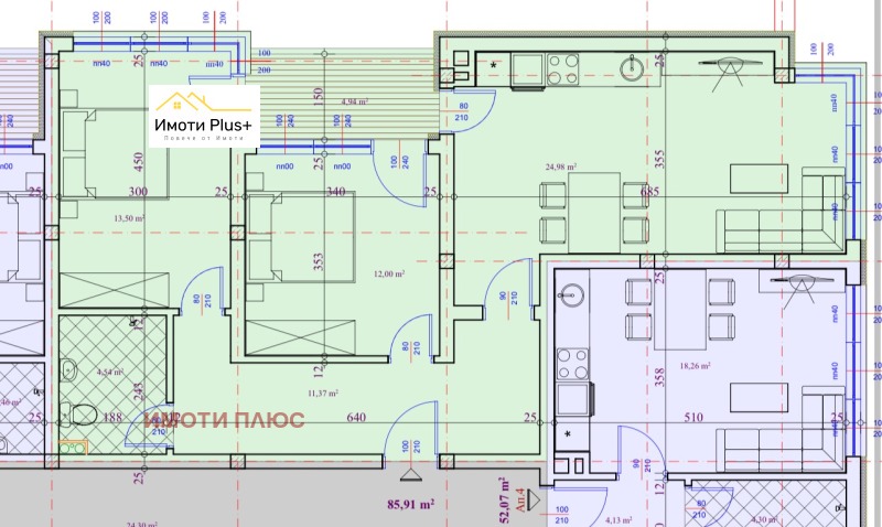Апартаментът се намира на 3-ти етаж от 5 и е с чиста жилищна площ 85,91 кв.м и обща площ с общи части 97,91 кв.м. Разпределението е удобно и практично просторна дневна с кухня, две самостоятелни спални, баня с тоалетна, втора тоалетна/мокро помещение, антре и тераса. Няма излишни коридори и загубени пространства.
