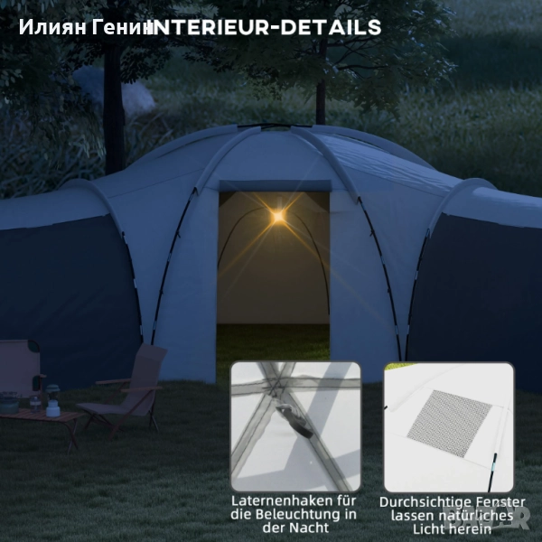 Светъл интериор: Два прозореца в семейната палатка осигуряват приятна, естествена светлина. Когато се стъмни, можете да окачите къмпинг лампа от фасунгата в центъра на просторната тунелна палатка, за да създадете уютна атмосфера.