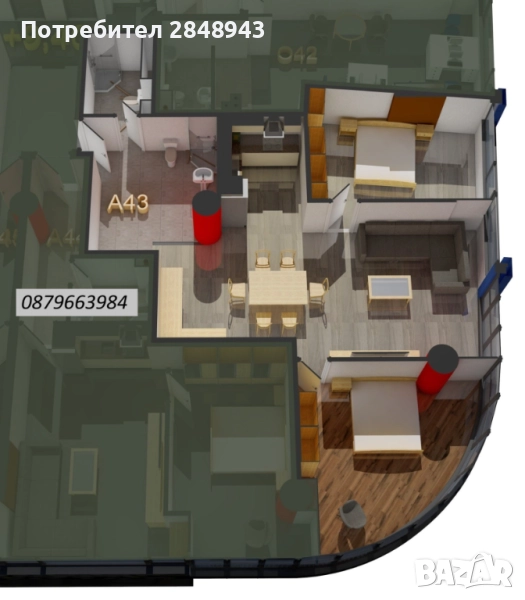 Жилището е изключително просторно, състои от предверие, два санитарни възела - голяма и малка баня и отделно самостоятелно мокро помещение, изключително прооооосторна дневна (9х5м.) с кухненски бокс (3,2х3,2м.), и две самостоятелни единични стаи.