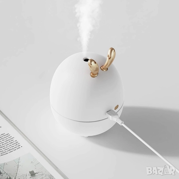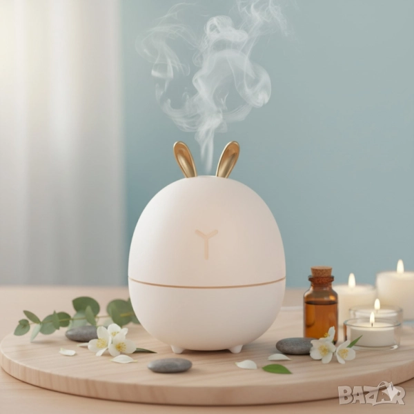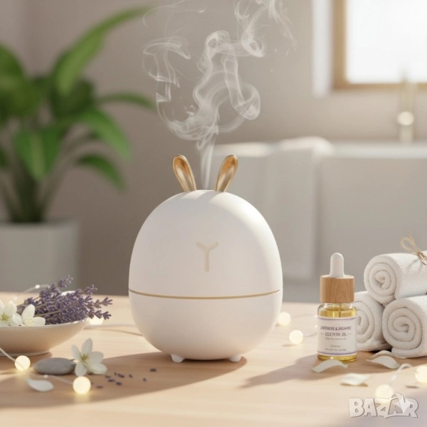 Продукт: USB Ароматерапевтичен овлажнител с дизайн на зайче; Основен проблем: Сух въздух в помещенията, който води до суха кожа, лющене и дискомфорт; Решение: Преносим овлажнител с етерично масло – овлажнява въздуха, хидратира кожата и създава приятна ароматерапевтична атмосфера; Функции: Безопасно автоматично изключване при ниско ниво на вода; Таймер: 4 часа / 6 часа; Допълнителни ползи: Очарователен дизайн със „зайчешки“ ушички – подходящ за подарък; Създава релаксираща атмосфера с аромати по избор; Поддържа здравословна влажност на въздуха и намалява дискомфорта от суха кожа; Размер: 11,9 x 7,8 x 7,8 см; Материал: ABS + PP (екологична пластмаса); Захранване: USB кабел; Тегло: Лек и преносим; Гаранция: 12 месеца.