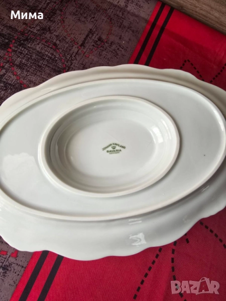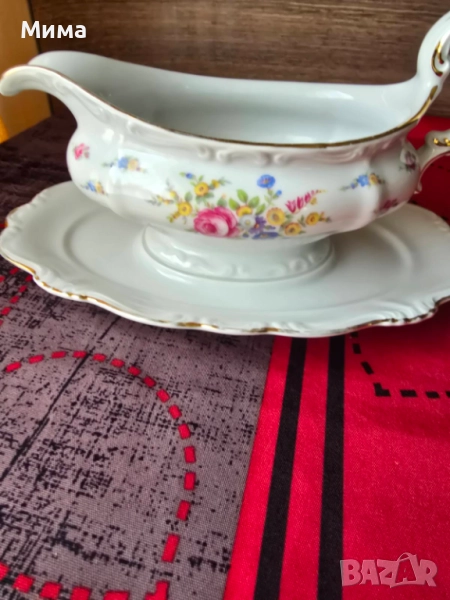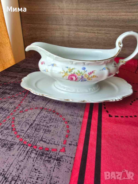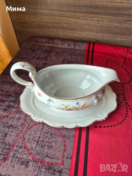 Винтидж немска сосиера с подложна чиния. В добро състояние за годините си. Забележки леко износване на златния кант. Има маркировка за произход.