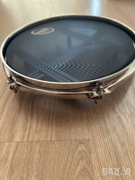 Чудесно соло барабанче за упражнения, съвсем тихо, поради еднослойната мрежеста кожа. Разнер 14 инча или около 35 см. Здрава метална конструкция. Има болтове, чрез които мрежестата кожа може да стегне или разхлаби напрежението на кожата, което е хубава функция, която ви позволява да настроите предпочитаното от вас усещане.