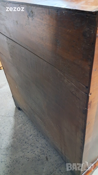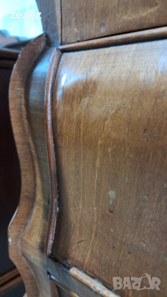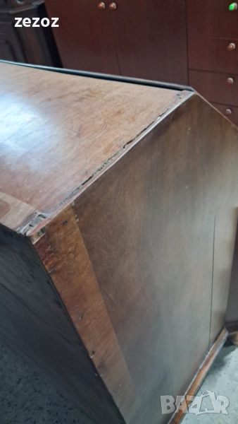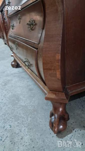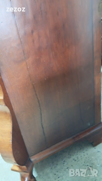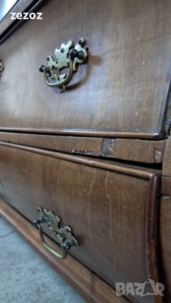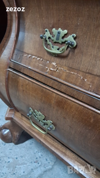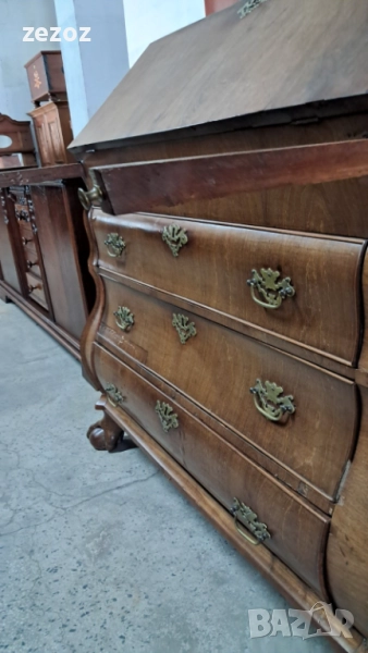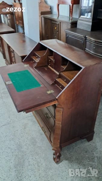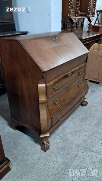 Антикварно бюро-секретер с барокови елементи, с лапи върху топки на предните крака.Пълен масив.Изработено най-вероятно в края на 19 началото на 20 век в стил Холандски барок.Секретера има слоеви история.Много стари поправки,по-нови,нарушения по фурнира,поправки по него.Подменени с времето са водачите на чекмеджетата,оригиналния обков и др.Затова тази мебел разказва как през почти 120-150 г е обичана,пазена и обгрижвана за да радва поколения.Конструктивно е здраво.Ключалките не работят,искат реставрация,но оригиналните два ключа са налични.Предаване само след оглед на място.