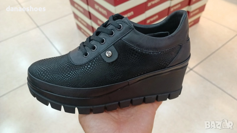 Дамски обувки от естествена кожа в интересен десен, имитиращ животински принт. Модела е с връзки, олекотен и много удобен. Височина на подметката отзад 6см, отпред 2,5см. Номерация 36-40. Налични в кафяво, черно и черно със сребристо.