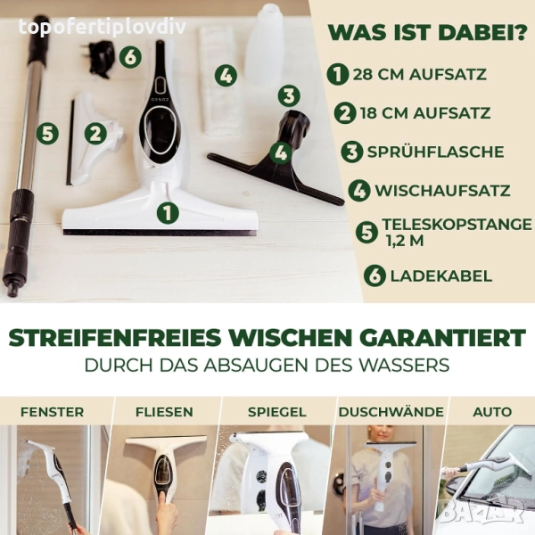 Безопасно и лесно- нашия електрически уред за прозорци ви позволява да премахвате мръсната вода бързо и ефикасно. Насладете се на светкавично чисти прозорци за рекордно кратко време и имайте повече време за красивите неща в живота!