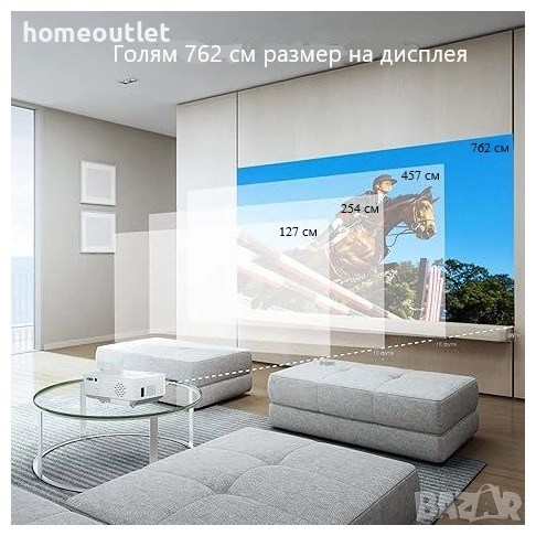 С разделителна способност от 1080p проектора с 4k качество ви предоставя размер на картината от 50„ до 300„ с прожекционно разстояние от 150 до 670 сантиметра.
