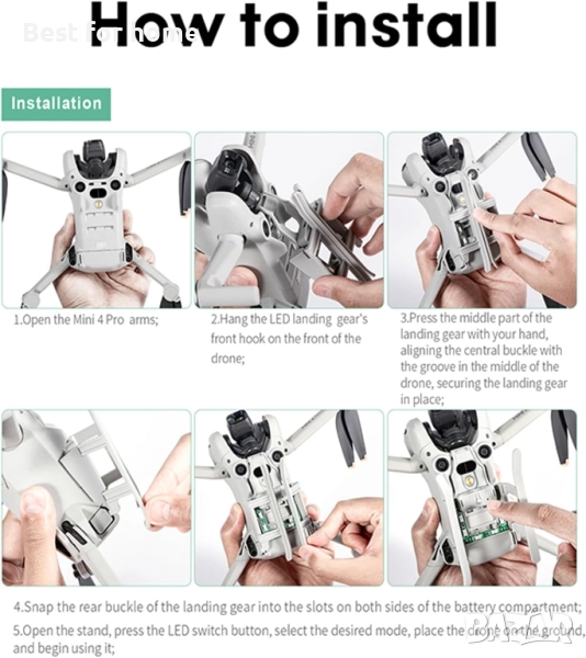 LED колесникът пасва идеално на извитата повърхност на корпуса на Mini 4 Pro, със скелетонизиран и резбован дизайн и няма да блокира индикаторните светлини, светлината за запълване, сензорите за пода и отворите за разсейване на топлината. Той също така разполага със сгъваем дизайн за бързо освобождаване, който няма да повреди корпуса на дрона и е лесен за инсталиране.