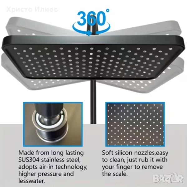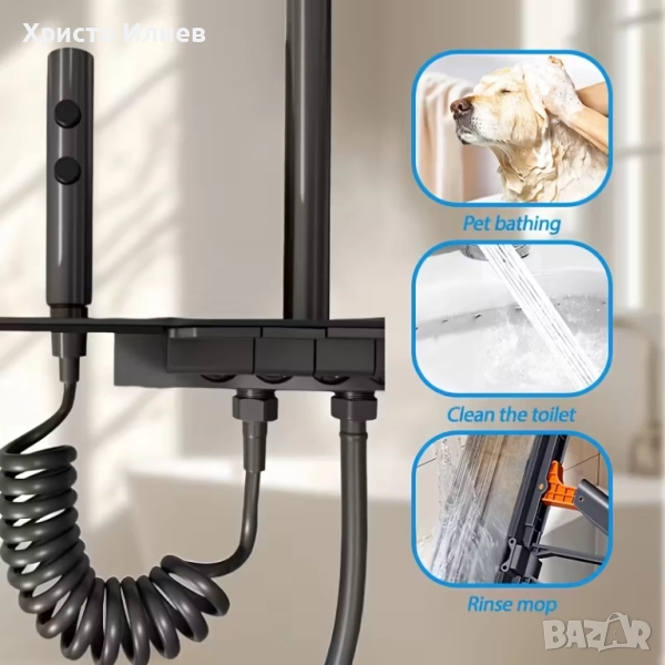 - Ръчен душ с възможност за регулиране на височината и ъгъла и три режима на работа и бутон за превключване между тях