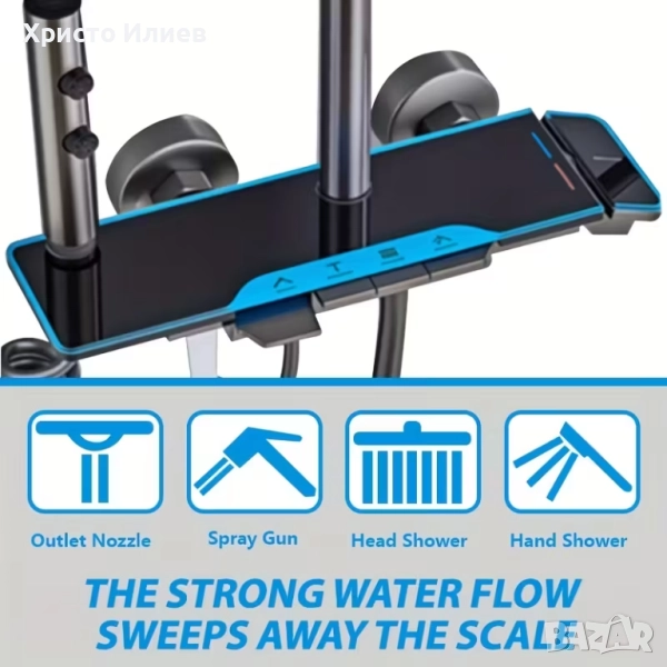 Комплекта съдържа батерия с модерен дизайн с 4 бутона за избор на режим на работа и бутон с Термостат за регулиране на температурата на водата