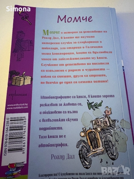Продава се детска книга "Момче" от Роалд Дал, издание на "enthusiast" с илюстрации от Куентин Блейк. Книгата е втора ръка, но в добро състояние. Подходяща за млади читатели и фенове на Роалд Дал