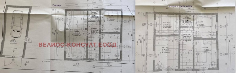 На втори етаж: кухня с три спални помещения, баня с тоалетна, на трети етаж: кухня с три спални помещения и санитарен възел. За размера на помещенията, прилагам арх. проект. Имотът е подходящ за 2-3 семейства, офис- представителство, медицински център или друга дейност.