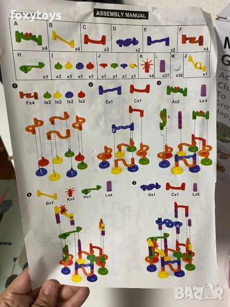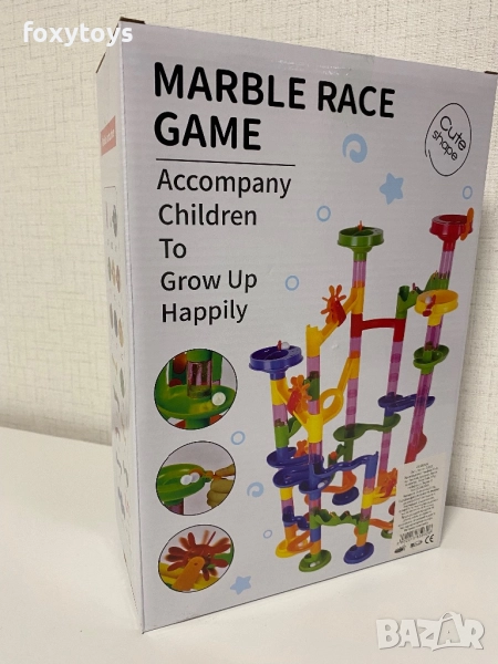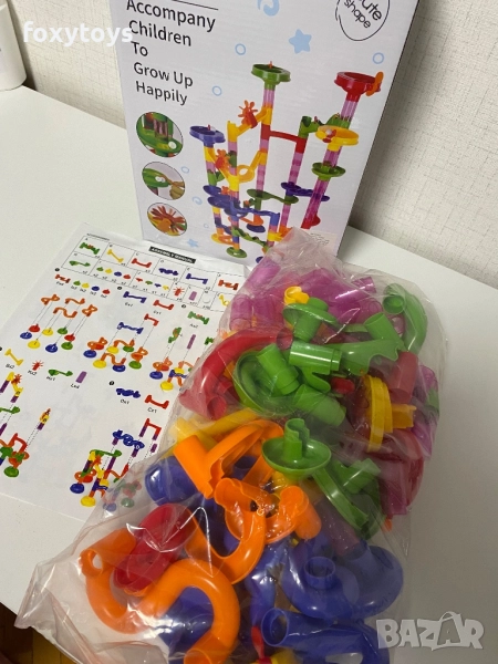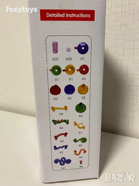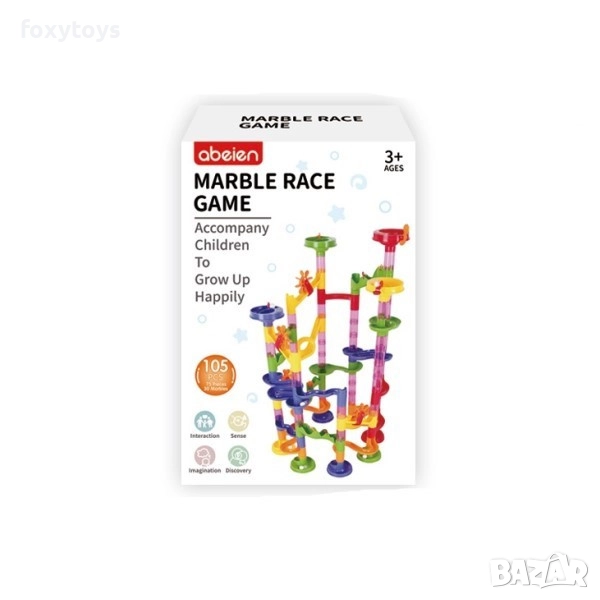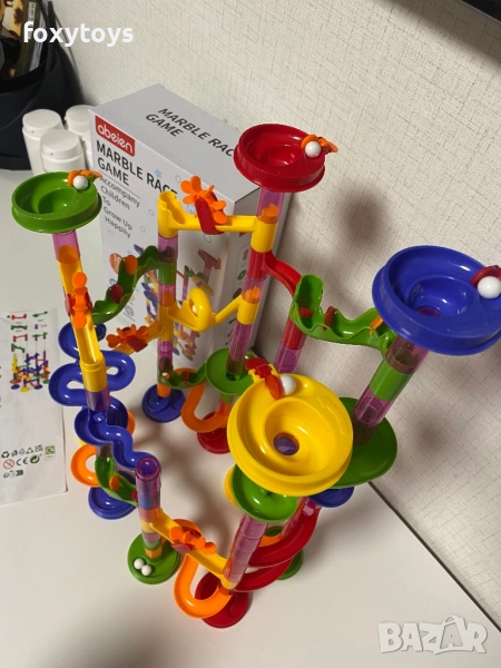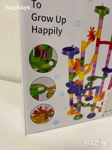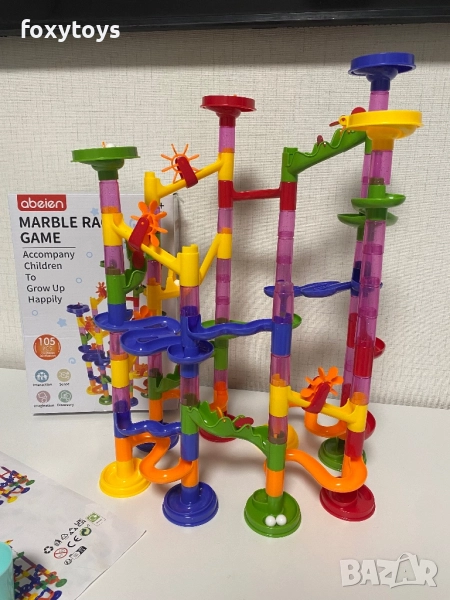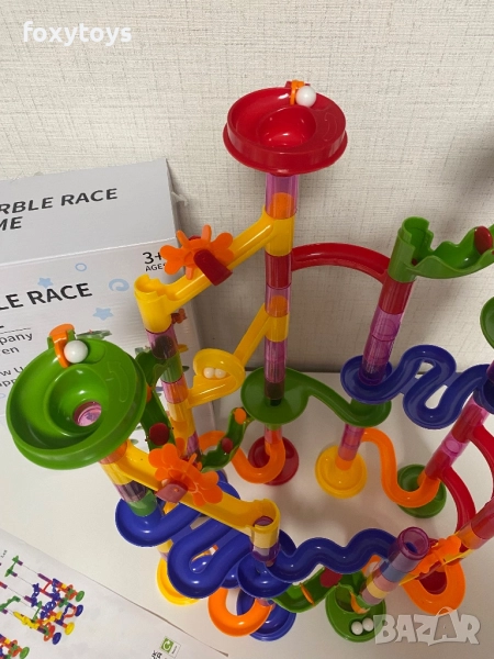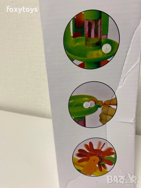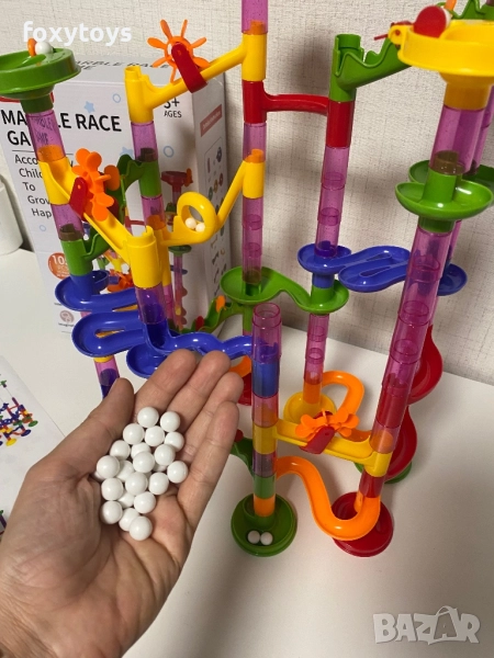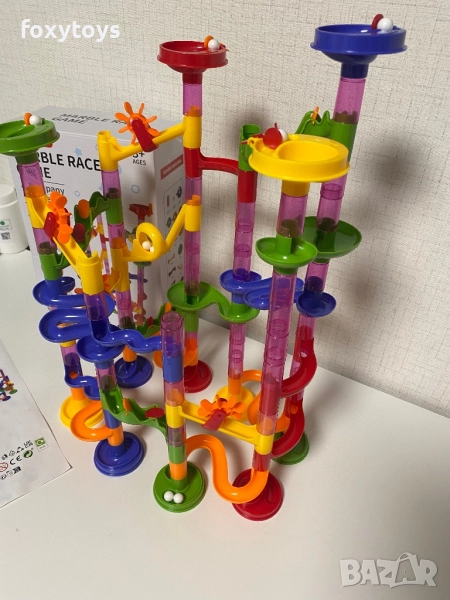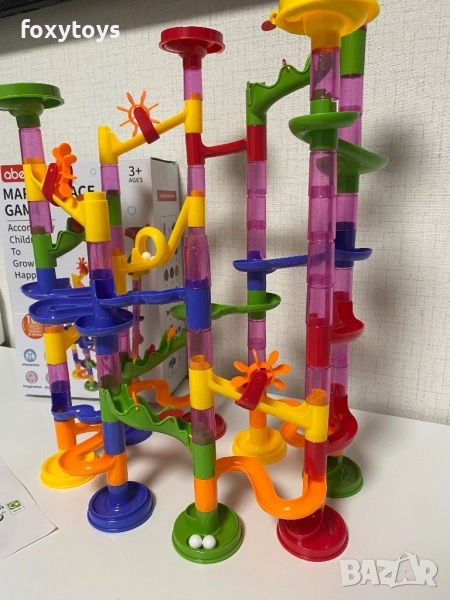 Забавлявайте се да сглобявате различни конструкции и да наблюдавате движението на топчетата по каскадното им спускане надолу.