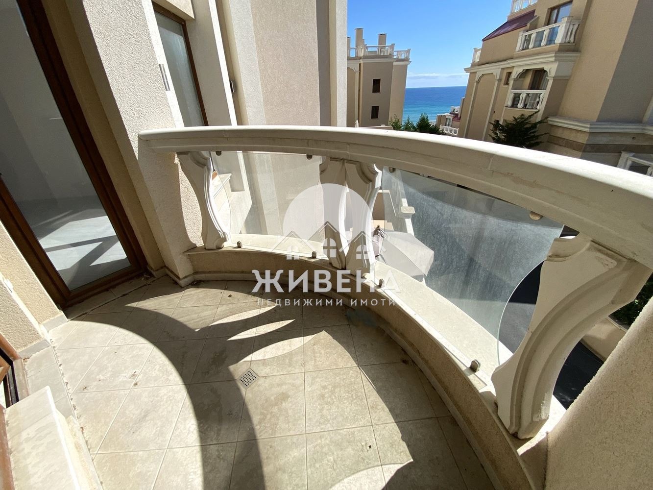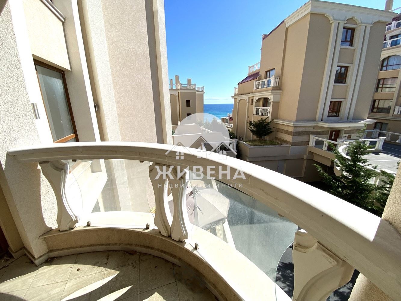 Агенция Живена предлага за продажба тристаен апартамент, до плаж Кабакум. Жилището е разположено на 2-ри етаж в луксозен затворен комплекс на първа линия море. Общата площ на имота е 114.87 кв.м, вкл. застроена площ - 90.22 кв.м, общи части - 17.84 кв.м + маза - 6.81 кв.м. Състои се от: коридор, дневна с вградена кухня, 2 спални, голям килер, баня с тоалетна, мокро помещение (отделна тоалетна) и тераса с гледка към морето. Предлага се завършен До ключ , без мебели, с поставени климатици във всяка стая, оборудвана кухня и баня. Подходящ е, както за живеене, така и за инвестиция. Комплексът разполага със собствен плаж, рецепция, панорамен асансьор, ресторант, бар, детска площадка, модерен СПА център с минерална вода, фитнес, фризьорски салон, маникюр и педикюр, масажни кабинети, вътрешен басейн с джакузи, два външни басейна, подземен и наземен паркинг със свободно паркиране, красива територия с озеленен двор с достъп основно от собствениците на апартаменти в комплекса. Сигурността е решена с денонощна жива охрана и видеонаблюдение. Такса поддръжка е 14.8 евро на кв.м/ годишно (13.8 евро/кв.м + 1 евро/кв.м за фонд ремонт). Наблизо има магазини и автобусна спирка. Има възможност за закупуване на паркомясто в комплекса.