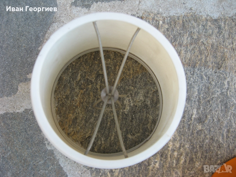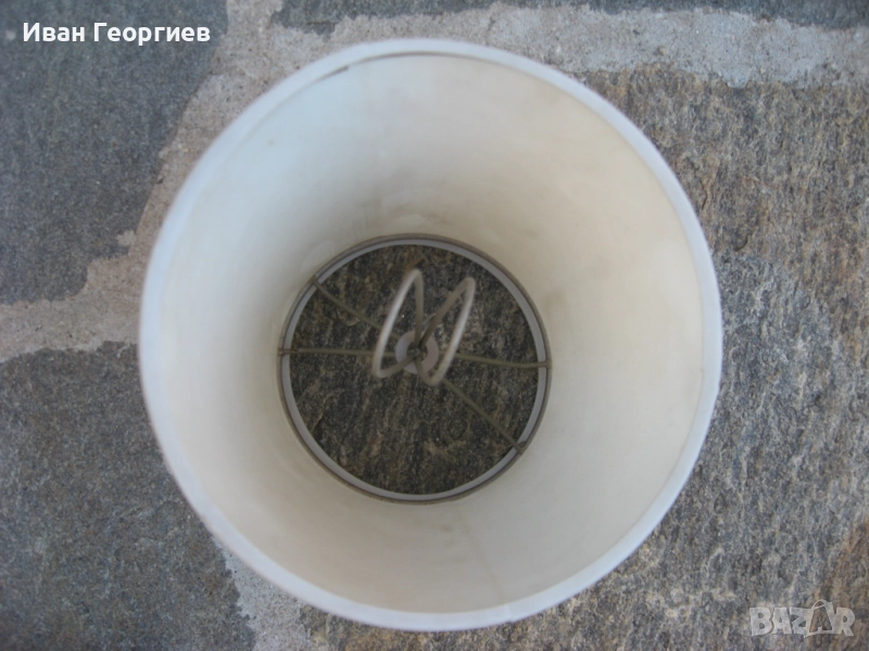 Стенен аплик с два броя абажури. Единия абажур не е облечен в плат. Фасунга Е14.