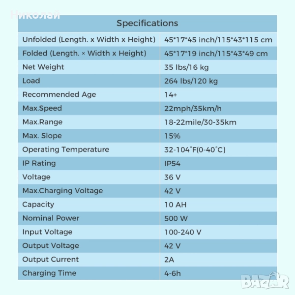 Капацитет на батерията 36–42 V, 10.4 Ah (приблизително 374-437 Wh)