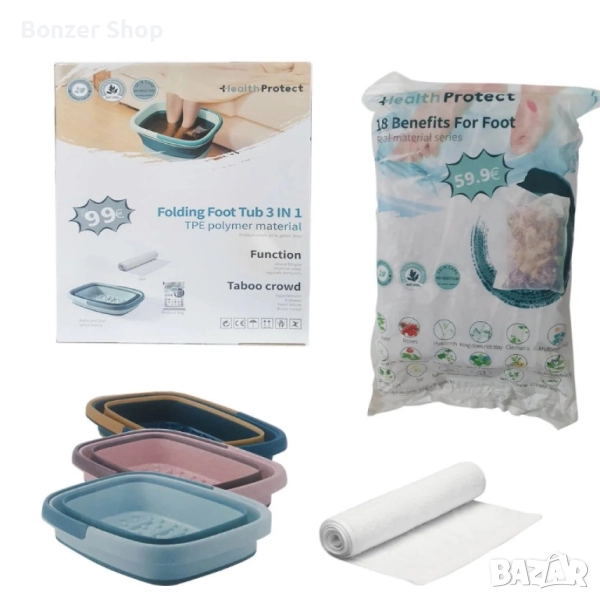 Комплектът включва: сгъваем леген за крака 3-в-1 (TPE полимер); 20 билкови сашета × 30 г (18 различни билки); кърпа за подсушаване (подарък);