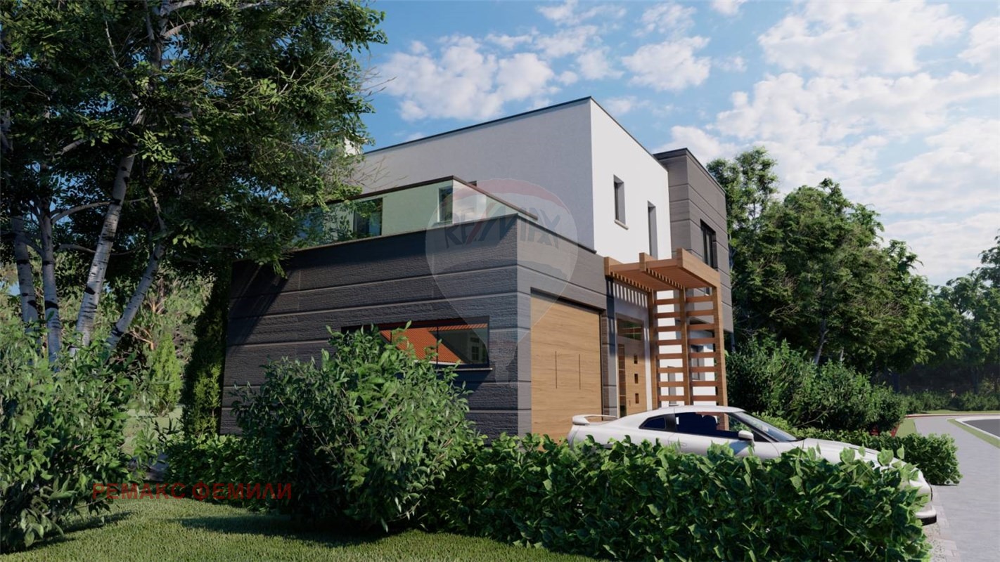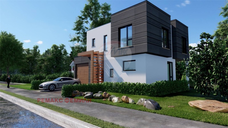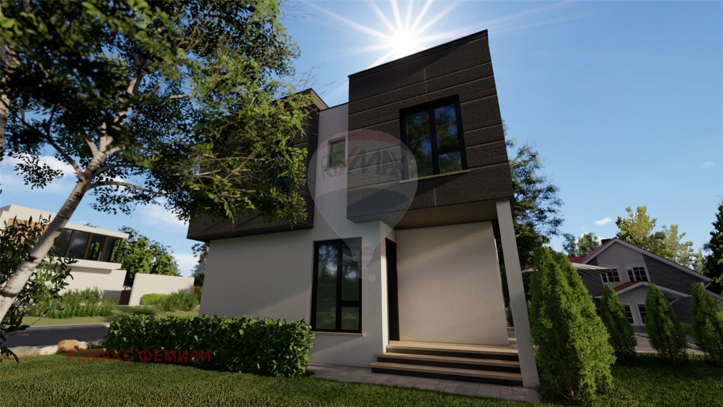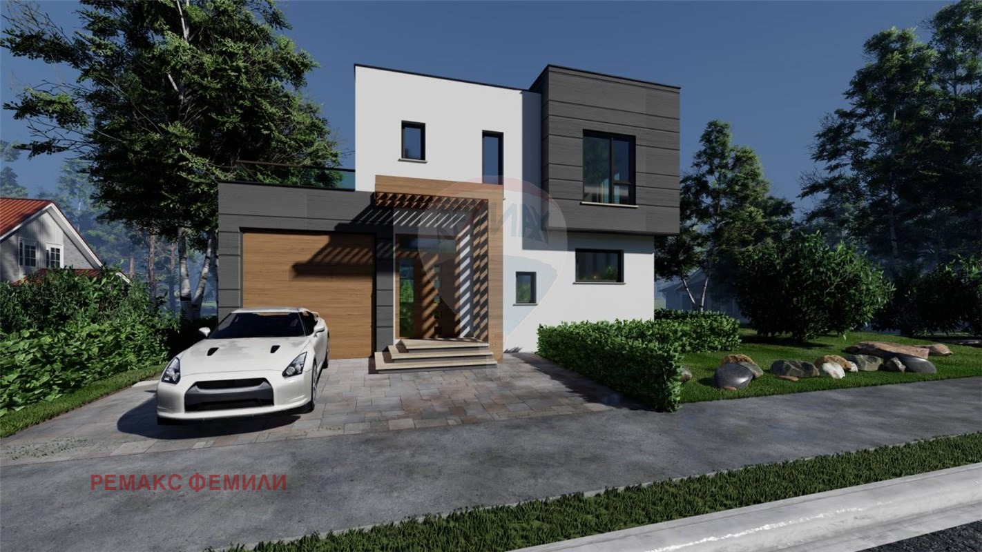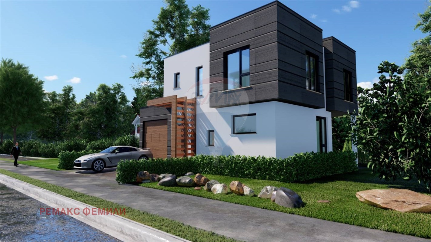 Еднофамилна, двуетажна , жилищна сграда със следното функционално разположение :първи етаж : дневна - трапезария -кухня с обща площ 47 кв.м с изложение юи/юз с витрини двустранно отваряеми тип 'хебе-шибе' ; входно антре, санитарен възел и гараж с топла връзка. Втори етаж : родителска спалня със собствен санитарен възел и дрешник и с излаз на слънчева, просторна тераса с площ 16 кв.м , две детски стаи обслужвани от комбиниран санитарен възел.Акценти : мазилка- силикат -силиконова в комбинация с еталбонд на растери; плосък покрив с паро-,хидро- и топло- изолация ; гаражна, секционна врата с дистанционно управление; мълниезащита на къщата и двора, видеонаблюдение.