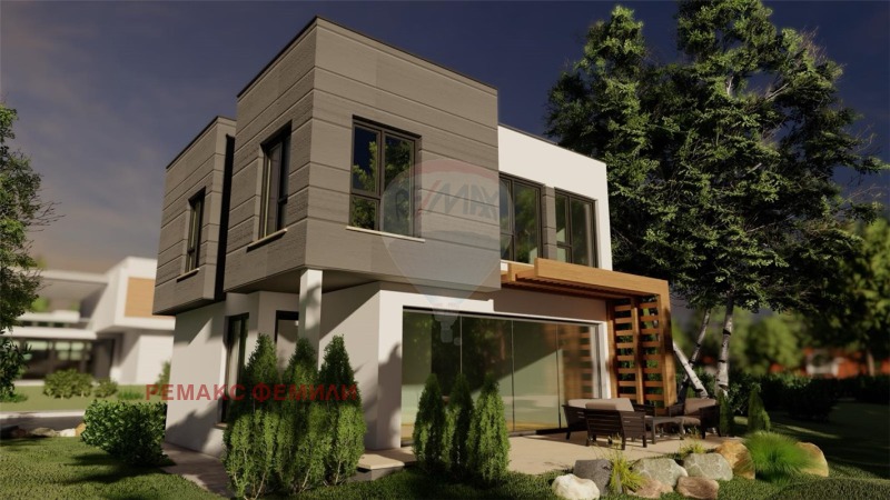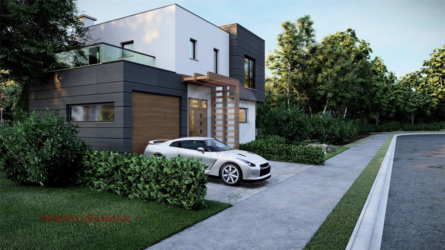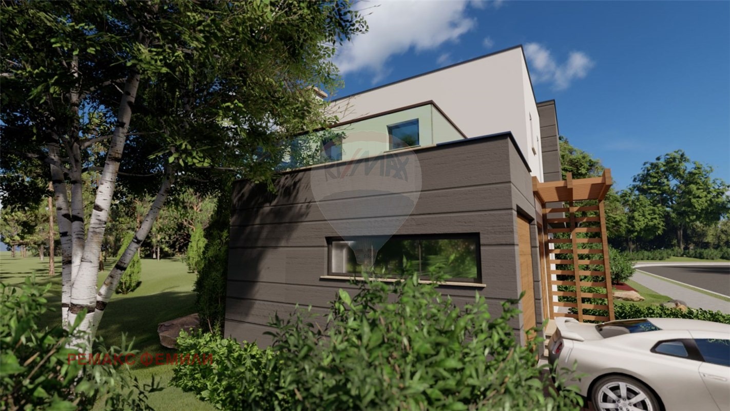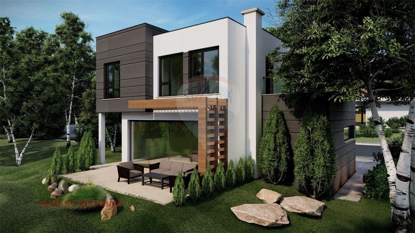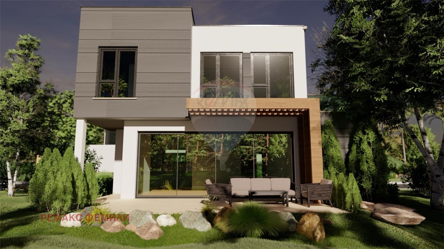 Еднофамилна, двуетажна , жилищна сграда със следното функционално разположение :първи етаж : дневна - трапезария -кухня с обща площ 47 кв.м с изложение юи/юз с витрини двустранно отваряеми тип 'хебе-шибе' ; входно антре, санитарен възел и гараж с топла връзка. Втори етаж : родителска спалня със собствен санитарен възел и дрешник и с излаз на слънчева, просторна тераса с площ 16 кв.м , две детски стаи обслужвани от комбиниран санитарен възел.Акценти : мазилка- силикат -силиконова в комбинация с еталбонд на растери; плосък покрив с паро-,хидро- и топло- изолация ; гаражна, секционна врата с дистанционно управление; мълниезащита на къщата и двора, видеонаблюдение.
