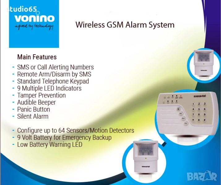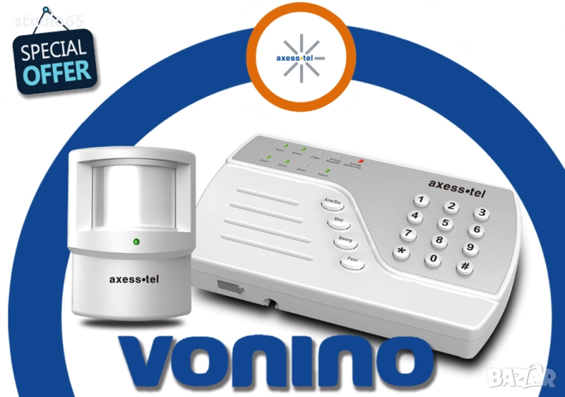 Безжична GSM алармена система Vonino от серията AxessTel e подходяща за дома, офиса, гаража и други.