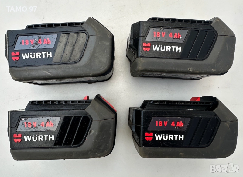 Продавам акумулаторна литиево-йонна батерия на Вюрт 18V 4.0Ah с индикатор от M-CUBE серията. Имам налични 4 броя в добро визуално състояние, също така работещи и държащи заряд от Франция. Обявената цена е за една батерия при покупка на 2 броя 160лв или 4 те заедно заедно за 300лв. Пращаме с опция преглед и тест с куриерска фирма еконт може и лично предаване за гр. Шумен.